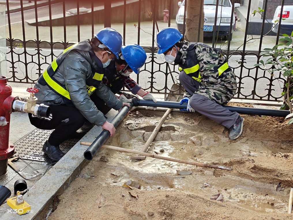 為保障黃石市新型冠狀病毒肺炎疫情防控指揮部將新建臨時食堂正常用水,2月3日,接到通知的當(dāng)天市自來水有限公司迅速安排客服中心、設(shè)計公司以及建設(shè)工程公司相關(guān)負(fù)責(zé)人趕赴現(xiàn)場,特事特辦,三個部門現(xiàn)場進(jìn)行勘測設(shè)計、制定方案并迅速組織材料施工,僅5小時便完成外部敷設(shè)供水管道96米、安裝閥門2臺,具備了通水條件。不忘初心,特殊時期依舊心系民生。2月1日,黃石公園一名用戶反映無水,公司立即安排經(jīng)營銷售公司與該物業(yè)公司聯(lián)系。經(jīng)了解,是該物業(yè)公司管理的一棟樓房高壓區(qū)無水。物業(yè)公司人員趕到現(xiàn)場查看后,分析可能是二次加壓泵壞了或管道破損漏水,希望得到專業(yè)的幫助。市自來水有限公司秉著盡快解決用戶用水問題的宗旨,安排管網(wǎng)維護(hù)公司檢測中心協(xié)助找到了漏水點并于當(dāng)天下午及時恢復(fù)了供水。
