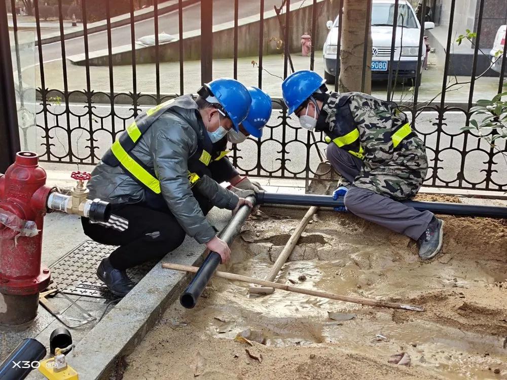 在抗擊疫情特殊時期,公司克服材料采購、車輛調(diào)度、人員安排等困難,特事特辦,當天便迅速安排公司客服中心、設(shè)計公司以及建設(shè)工程公司相關(guān)負責人趕赴現(xiàn)場,進行勘測設(shè)計、制定方案并組織材料施工,僅5小時便完成外部供水管道敷設(shè),具備了通水條件。