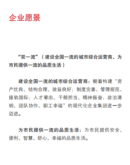企業(yè)愿景:“雙一流”(建設全國一流的城市綜合運營商、為市民提供一流的品質生活)