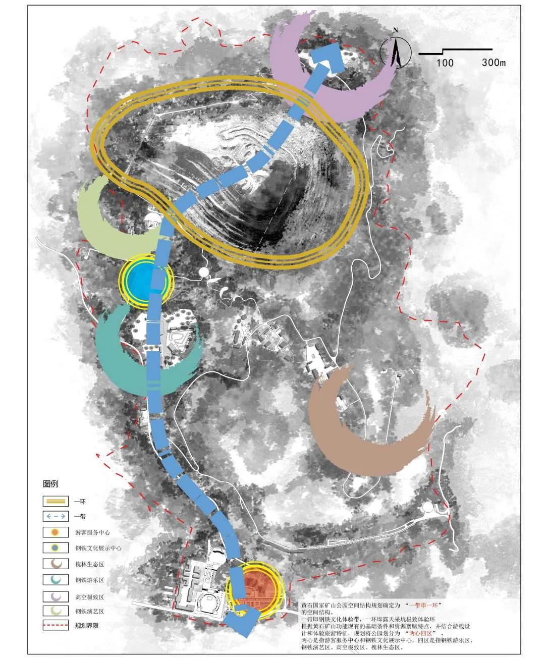 礦山公園空間結(jié)構(gòu)規(guī)劃確定為“一帶串一環(huán),兩心四區(qū)”,一帶是指鋼鐵文化體驗(yàn)帶;一環(huán)是指露天采坑極致體驗(yàn)環(huán);兩心是指游客服務(wù)中心,鋼鐵文化展示中心;四區(qū)是指鋼鐵游樂區(qū)、鋼鐵演藝區(qū)、高空極致區(qū)、槐林生態(tài)區(qū)。