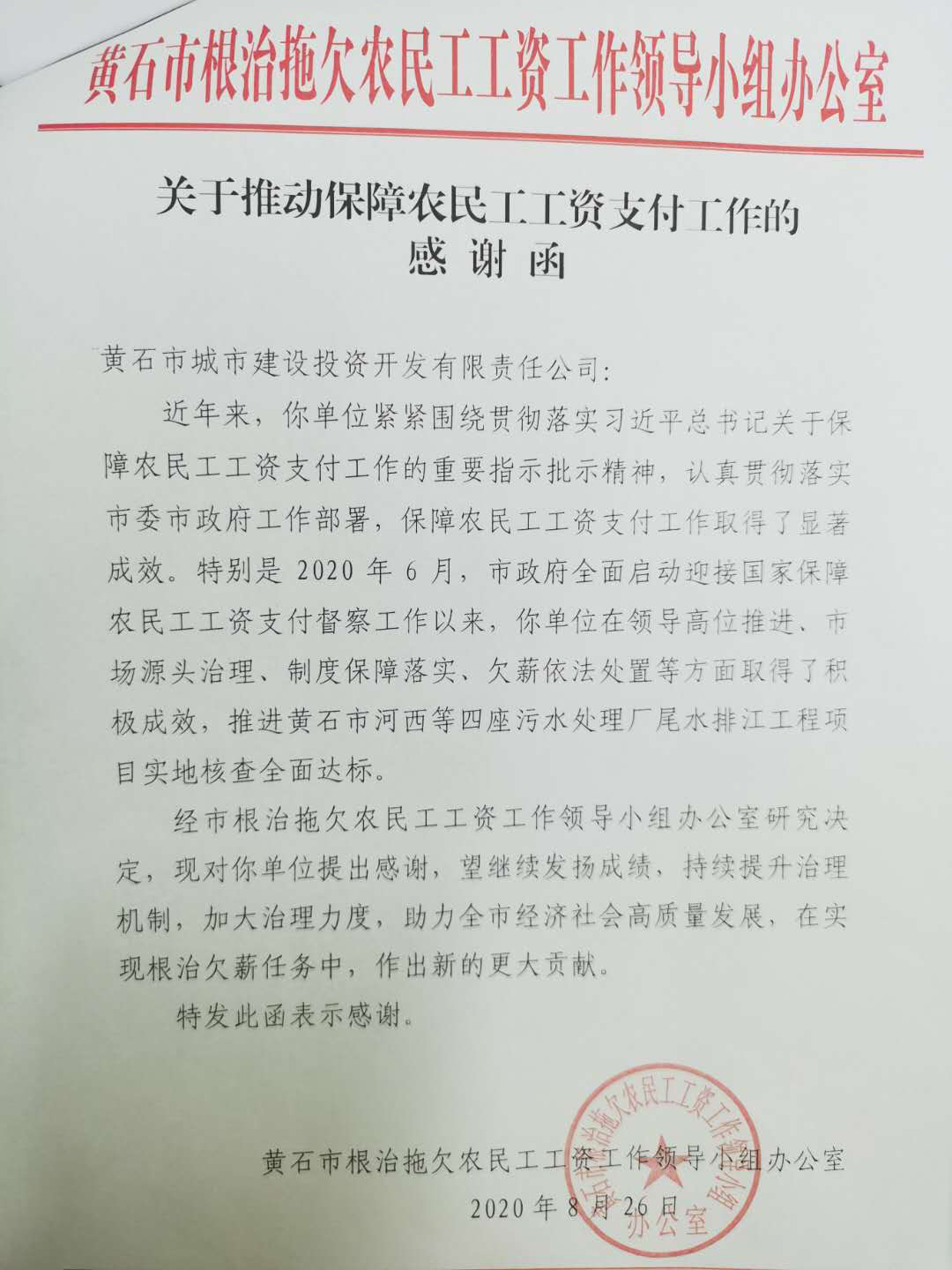近日,黃石市根治拖欠農民工工資工作領導小組辦公室來函感謝市城發(fā)集團近年來在保障農民工工資支付工作方面的努力,充分肯定了市城發(fā)集團各建設項目在領導高位推進、制度保障落實、欠薪依法處置等方面取得的積極成效,并希望持續(xù)提升治理機制,加大治理力度,作出更大貢獻。