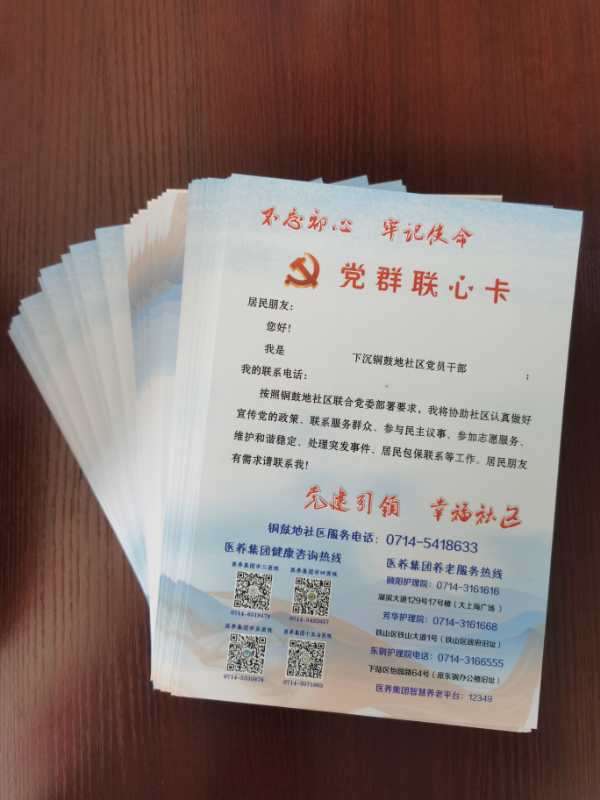 李京鶴表示,此次發(fā)放“黨群聯(lián)心卡”是下沉黨員干部入戶宣傳的一種有效措施。鄂東醫(yī)養(yǎng)集團(tuán)聯(lián)系社區(qū)工作隊(duì)精心制作的“黨群聯(lián)心卡”,靈活解讀下沉社區(qū)工作任務(wù),讓居民更深入了解政策,建立起便捷的溝通橋梁,有利于更好發(fā)揮網(wǎng)格化管理作用,在居民需要幫助的時(shí)候能夠及時(shí)聯(lián)系到社區(qū)下沉黨員干部。同時(shí),結(jié)合醫(yī)養(yǎng)集團(tuán)醫(yī)療養(yǎng)老資源優(yōu)勢(shì)和社區(qū)老年群體較多的特點(diǎn),將醫(yī)養(yǎng)集團(tuán)各直屬醫(yī)院、養(yǎng)老服務(wù)機(jī)構(gòu)健康熱線進(jìn)行了公布,用心用情提升入戶結(jié)對(duì)成效。