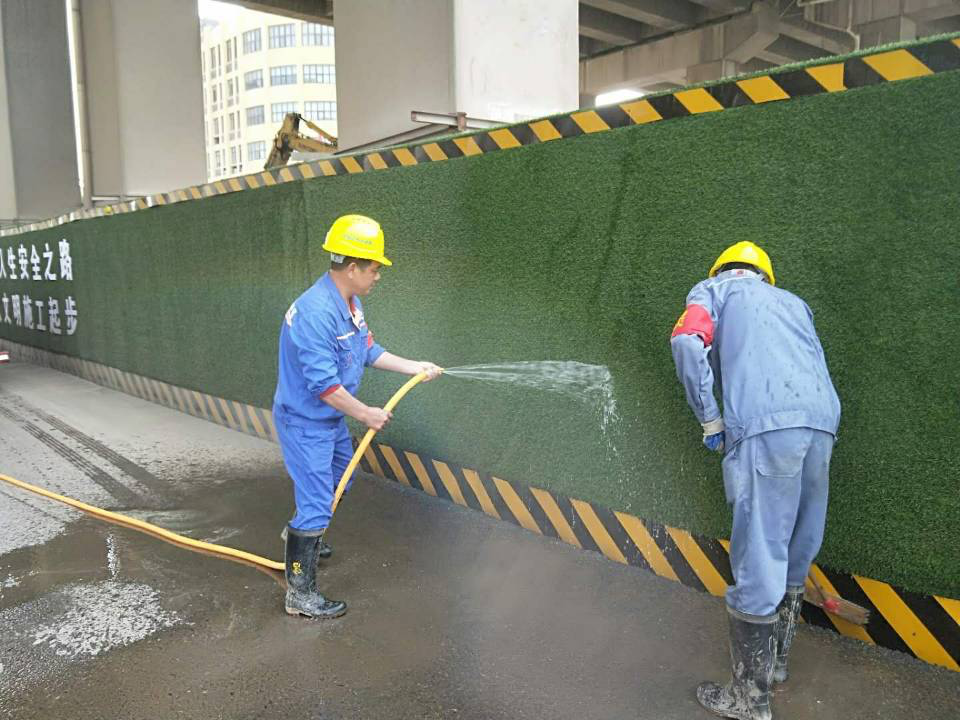 黃石大道北延項(xiàng)目施工單位派專人清洗圍擋