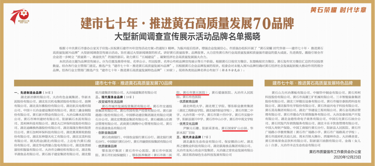 據(jù)悉,為振興疫后經(jīng)濟(jì),增強(qiáng)企業(yè)發(fā)展信心,市質(zhì)量強(qiáng)市工作委員會(huì)辦公室組織開(kāi)展了“黃石榮耀 時(shí)代華章——建市七十年·推進(jìn)黃石高質(zhì)量發(fā)展70品牌”大型新聞?wù){(diào)查宣傳展示活動(dòng)。該活動(dòng)以黃石建市70年為契機(jī),全面梳理和推介黃石品牌,最終推選出70個(gè)有廣泛社會(huì)知名度與影響力、在行業(yè)內(nèi)處于領(lǐng)先地位、取得顯著經(jīng)濟(jì)效益和社會(huì)效益的企業(yè)或其產(chǎn)品品牌。本次公布的“建市七十年·推進(jìn)黃石高質(zhì)量發(fā)展70品牌”,是從前期公布的近600家候選企業(yè)(品牌)中經(jīng)過(guò)專家評(píng)審、網(wǎng)民投票,并結(jié)合各行業(yè)主管部門(mén)意見(jiàn)而推選產(chǎn)生的。