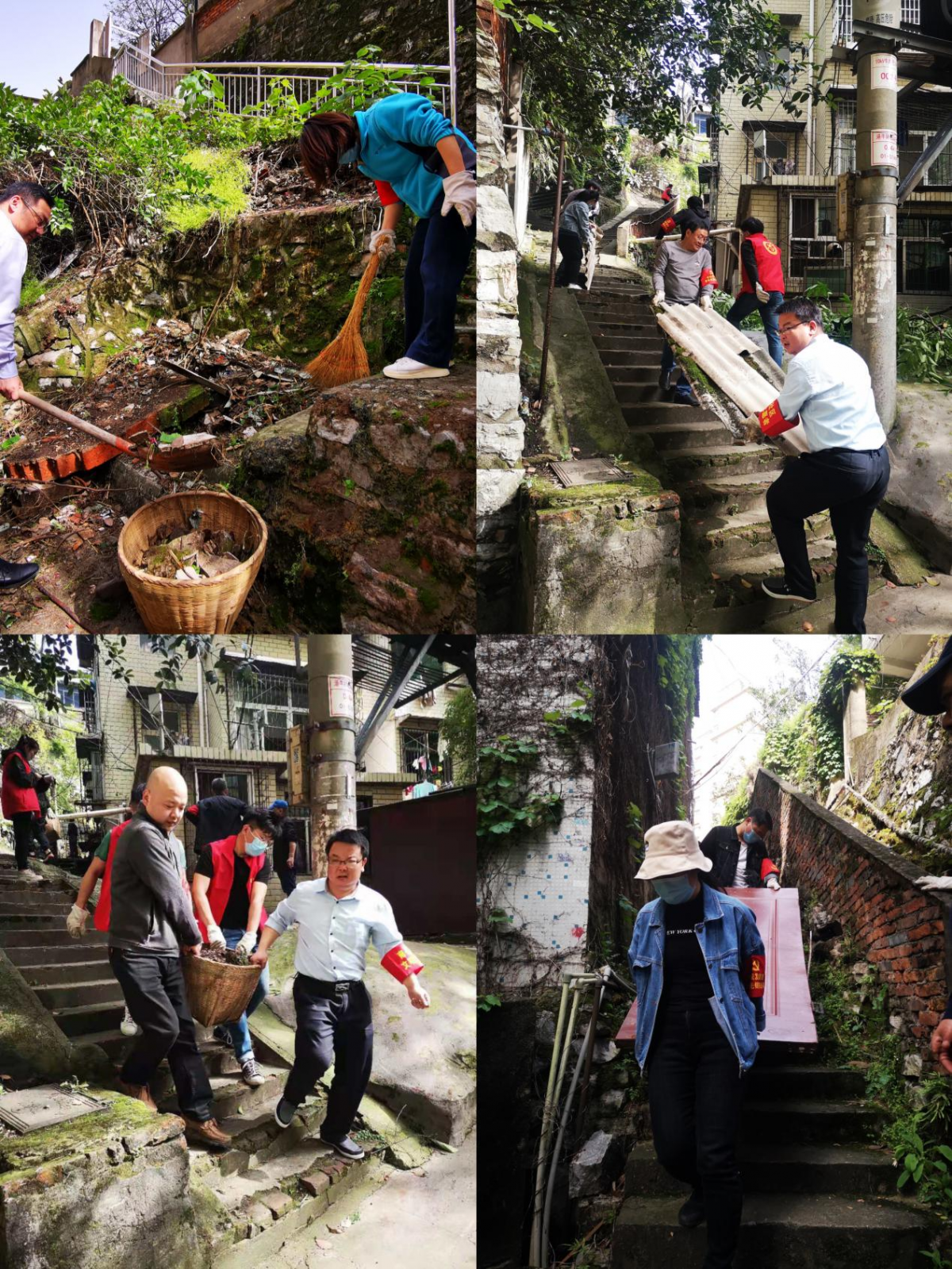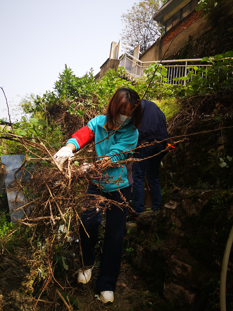 此次活動,志愿者們主要負責對依山而建的公共小路、拐彎死角等進行建筑垃圾及雜草清理。在社區(qū)工作人員的引導下,志愿者們分工協(xié)作,男同志們負責清理建筑垃圾,女同志們負責清除雜草、青苔及生活垃圾。山間的樓梯小路因為太窄,推車無法上去,志愿者們只能一鍬一鏟地把碎石、渣土等垃圾裝進竹簍里,再一簍一簍抬下山。為了徹底清理墻體上的青苔,志愿者們用雙手將青苔一點一點扒下來,夠不著的高處,就用鐮刀一點一點把青苔刮下來,只要肉眼可見的垃圾,都是大家的清理目標。
