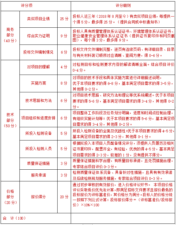 滿分為100分。其中商務部分為40分,技術(shù)部分為40分,價格部分為20分。綜合得分最高值為第一中標候選人。