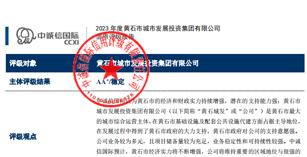 中誠(chéng)信國(guó)際信用評(píng)級(jí)有限責(zé)任公司確定黃石城發(fā)集團(tuán)主體長(zhǎng)期信用等級(jí)為AA+,評(píng)級(jí)展望為穩(wěn)定。黃石城發(fā)集團(tuán)是黃石地區(qū)目前唯一一家,也是湖北省內(nèi)繼宜昌、襄陽(yáng)、荊州后,第四個(gè)地級(jí)市中榮獲中誠(chéng)信評(píng)級(jí)公司AA+主體信用等級(jí)的國(guó)有企業(yè)。